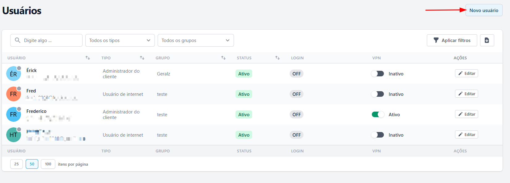 E na tela a seguir preencher os campos. Nome completo do usuário de preferência com as iniciais em maiúsculo. Grupo do usuário, definir em qual grupo esse usuário irá ficar. Tipo se usuário será Usuário de Internet. Senha você pode criar uma manualmente ou solicitar que seja gerada uma senha aleatória (senha aleatória será enviada para o e-mail que foi informado no campo E-mail). Basta preencher todos os campos e clicar em salvar. Repita isso e crie todos os usuários de internet.